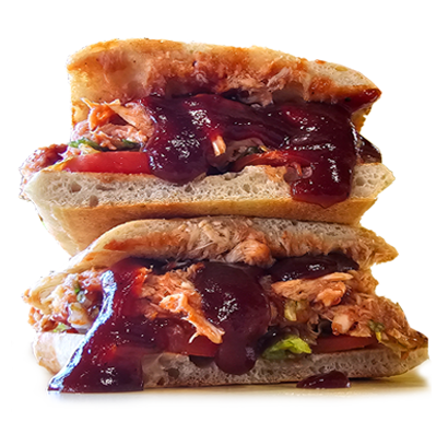 Rotisserie Chicken with Sweet Smoked BBQ sauce, sliced tomatoes, red onions and chopped romaine.